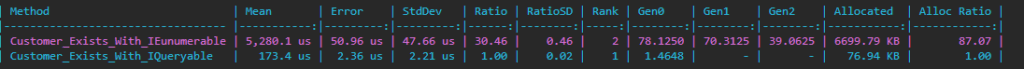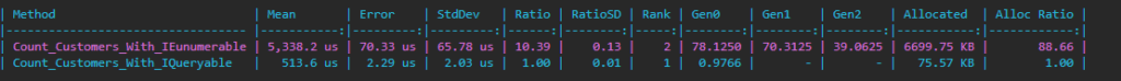 As you can see, using IQueryable for counting results in a much faster execution time (10x faster) and lower memory usage (90x times) compared to using IEnumerable. Always prefer IQueryable for operations that can be translated to SQL and executed on the database server.