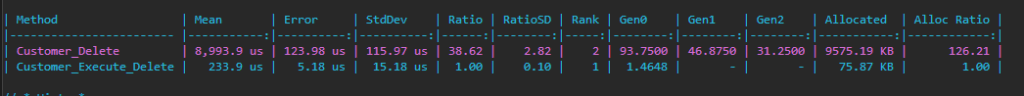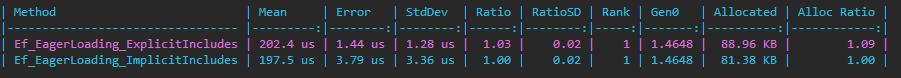 In this example, using Select to project only the necessary fields doesn’t show a significant performance improvement in execution time, but it does reduce memory usage by 10% compared to using Include. The benefits become more pronounced with larger datasets or more complex related entities.