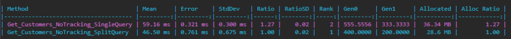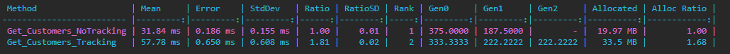 You can see that using AsNoTracking() improves query performance by 81% and 68% of RAM usage compared to tracking enabled. The effect is more pronounced with larger datasets.